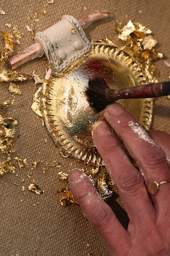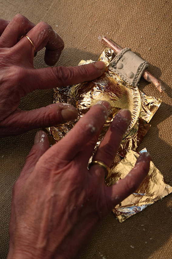 La Bulla prende forma da una base organica in polpa di cellulosa, trasformata attraverso un processo artigianale. La superficie viene poi dorata a missione: una tecnica delicata che stratifica la luce e restituisce all’oggetto una presenza vibrante e viva.